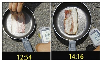 7月30日12时54分,记者往平底锅中放置了一片生培根,并将平底锅放置在上海徐家汇商圈的马路上。生培根片煎至八分熟一共用时约80分钟,整个过程中地面温度一直高于60℃。当日,据上海市中心气象台消息,上海最高气温达39℃。据新华社