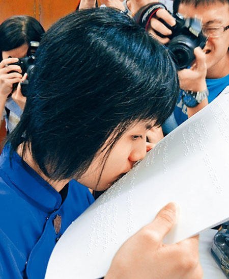 曾芷君硬是慢慢摸索出自己的方法——以双唇代替双手阅读。在心光盲人学校里长期任职的莫小丽老师也表示,她是学校里唯一一个“吻”书的孩子。