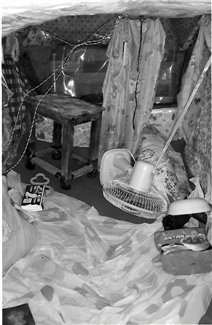 打开木门,地窖就在眼前:目测3米长,1米宽,1.5米高。洞内四壁用水泥浇注,洞顶上盖了棉被,底部有地毯。洞内还安装了电灯、电风扇,最里面放了一个桶,估计是大小便用的。洞内有一股污浊的气息,凌乱地散放着康师傅方便面,还有苏菲卫生巾。墙壁上挂着《大秦帝国》的碟片。