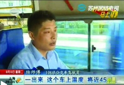 乘客说:“司机真辛苦,满头大汗,我们上来了,马上就下去,司机一直在这车上走。”108路公交车驾驶员陆师傅说:“这个车上温度,将近45℃,一圈开下来,身上的衣服不会干的。今年更是特别难受。”