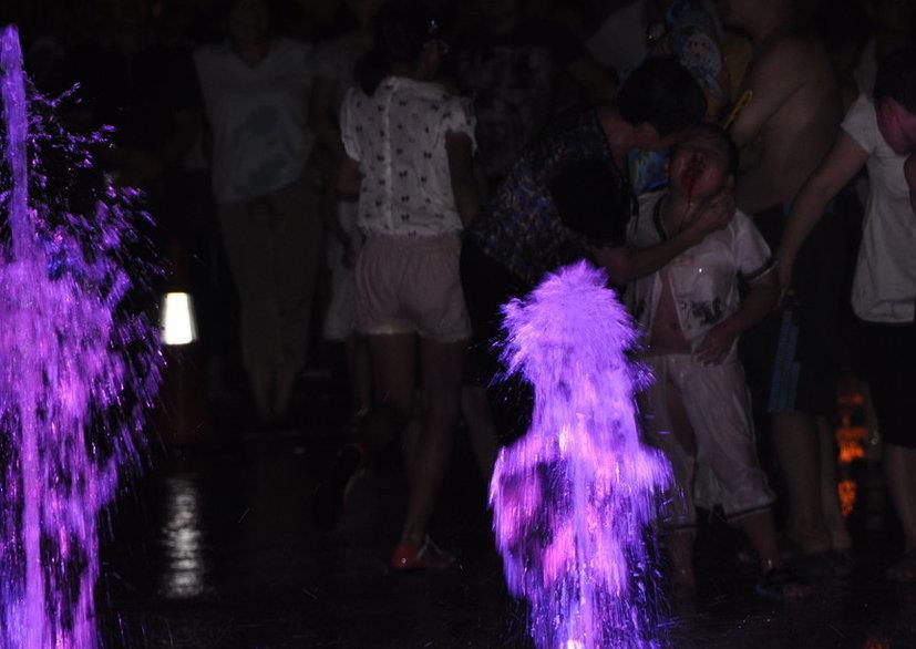 晚上9时许,喷泉内已有不少小孩正在嬉戏。在喷泉的中心位置,突然看到一名小男孩被冲向空中近2米处,然后被抛回地面,被人扶起时该小男孩鼻唇流血,衣裤已被高压喷泉冲破。