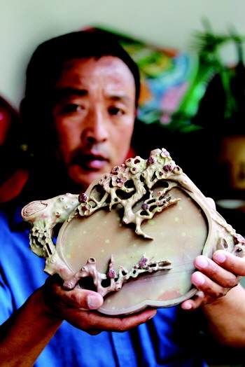 刘祥伦,蒙阴人,自小就爱各种奇石,无论走到哪里,他都忘不了捡上几块石头带回去。伙伴都称他为“小石头”。后来,他开始试着把石头雕成小动物。在武警部队期间,他自学了石雕技术,尤其善长雕刻砚台,他创作的作品多次获奖,有的还被名家收藏。部队转业后,他仍刀笔不辍,10余年的制砚经历,让他成为临沂市有名的民间制砚艺人。