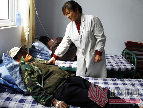 生病的农民工在零工市场内的卫生室打点滴(资料片)。 记者 展萍 摄