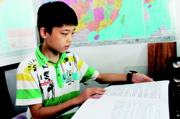 瓜子脸,浓眉大眼,一笑眼睛就弯成两弯月牙,浑身上下透着一股子机灵劲。子檀给人的印象就是一个聪明好学的孩子。在他家里,沙发旁、书橱里、学习桌上到处都摆放着书,从童话、小说到科普类应有尽有。