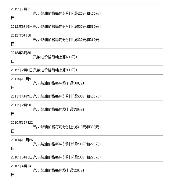 油价历次调整情况一览表: