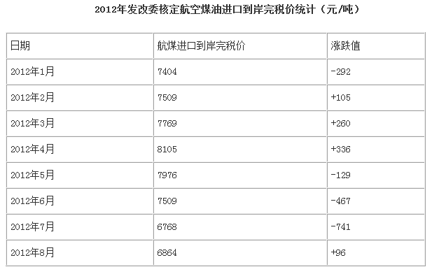 进口到岸完税价外加三大油企的价格贴水,便是国内航空煤油平均出厂价。据悉,2012年下半年中国石油、中国石化、中国海油供中国航空油料公司的航空煤油每吨贴水在40-50元,平均贴水44元。据此推算,9月份国内航空煤油平均出厂价为每吨7538元。而上个月,国内航空煤油出厂价刚刚小幅上调96元/吨。