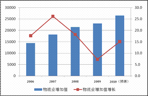 我国物流业增加值2010年预计为2.7万亿元,“十一五”时期将达到10万亿元,是“十五”时期的2.2倍,年均增长16.7%。物流业增加值占GDP的比重由2005的6.6 %提高到2010年的6.8%左右,对国民经济的贡献有所增强。